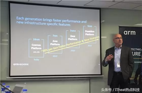 在Neoverse处理器IP路线图中我们可以看到Arm在明年就会推出7nm制程工艺的Ares平台,2021年实现推出5nm工艺的Poseidon平台,并且每一代的平台将提升30%的性能。要知道英特尔在10nm工艺制程上就已经耗费了很长时间,Arm能够提出这样的规划路线足以看出其强大的技术实力。