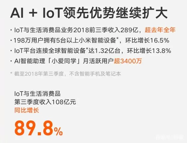 根据小米集团第三季度财报显示,他们在IoT与生活消费品业务前三季度收入289亿元,已经超越去年全年,其中仅仅是在第三季度,小米在该市场的收入已达108亿元,同比增长了89.8%之多。同时IoT平台连接全球智能设备已达1.32亿台,环比增长13.8%。其中,拥有AI智能的小爱同学月活跃用户也超过了3400万,这成绩也算是业内标杆了。