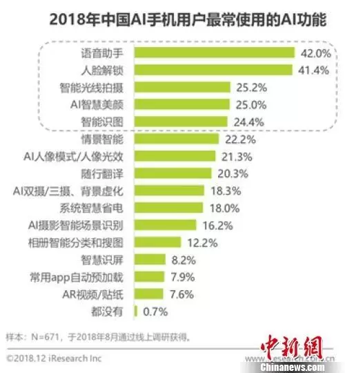 根据报告,在“2018年中国AI手机用户认为最有价值的AI功能”TOP10中,视觉类AI功能占据七席,其中人脸解锁功能居首。除人脸解锁以外,智能光线拍摄、AI智慧美颜和智能识图也同时出现在“2018年中国AI手机用户最常使用的AI功能”前五位当中。