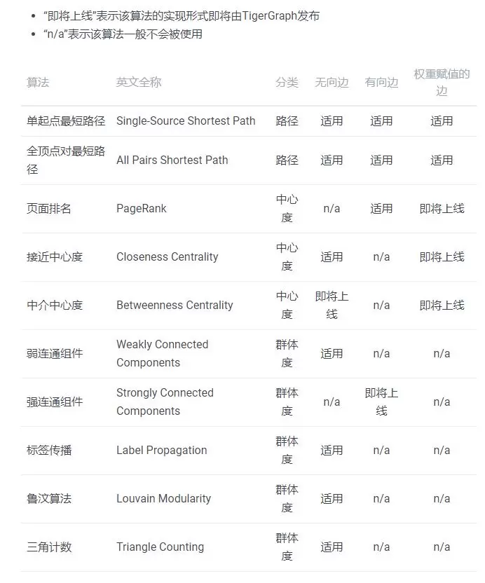 目前,GSQL的图形算法库中开源的核心算法可分为三类:路径搜寻的算法、衡量中心度的算法以及衡量群体度的算法。