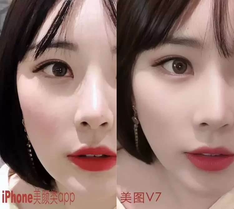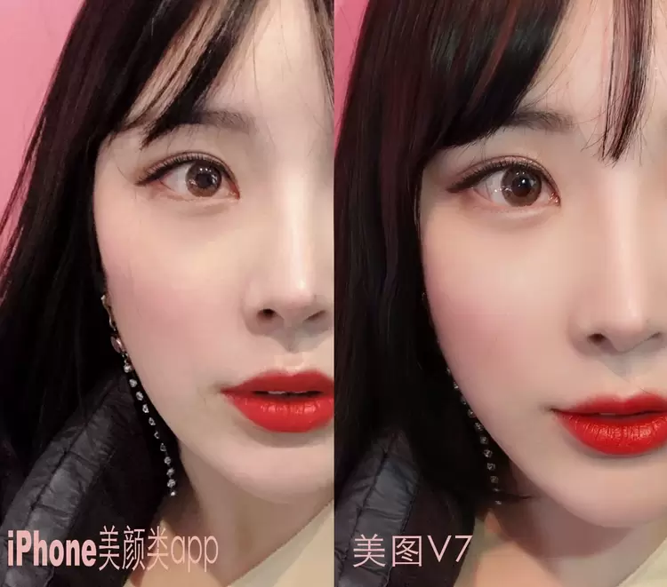 为了让大家更直观地感受,MOOM还在同样的场景下使用了iPhone+美颜类APP做了特写对比。可以看到,除了光线和色彩的处理表现出众之外,美图V7在皮肤的呈现方面也非常“能打”,保留了肌肤的质感的同时还通过3D多维人像算法做到了自然的无暇,奶油肌效果出众;同时细节的完整度也保留得非常好,睫毛根根分明,唇部的纹理也清晰可见,继续保持了美图家族的“0磨皮的美颜”审美,非常好看。对比之下,美颜类APP处理出来的照片则稍显“生硬”了。