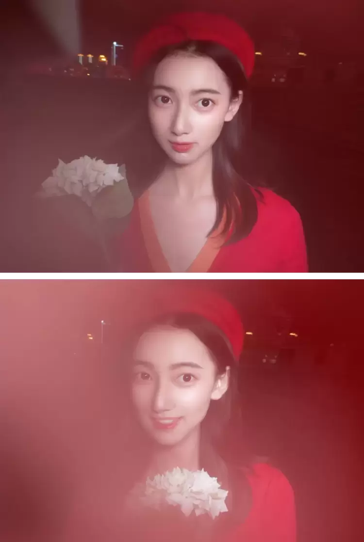 绿色光斑纱布离人像更近时,则又会营造出不同的气氛,成片更具胶片色调和质感,加上美图V7的夜景拍摄实力,哪怕漆黑的环境中也能拍出艺术感十足的大片!比如下面这一组照片,就是在MOOM家漆黑的天台上拍摄的,是不是真的难以置信!
