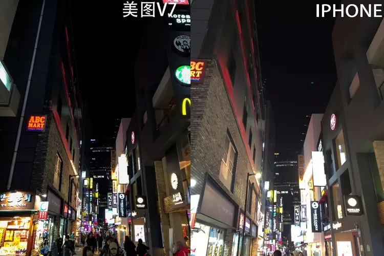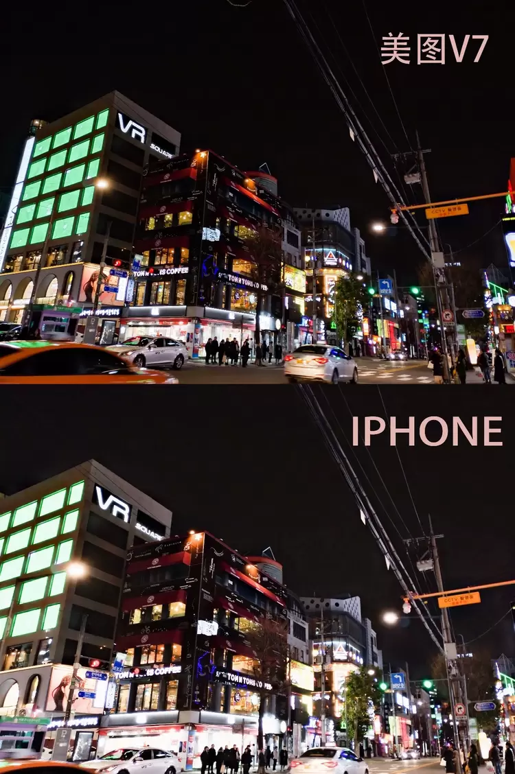 MOOM也展示了同场景同角度下美图V7和iPhone的照片对比,整体来说,美图V7拍摄的夜景高光不曝,暗部细节也能很好地保留,相比之下iPhone直出的照片则很明显受到了街上不同光源的影响,过曝的同时也损失掉了很多细节。