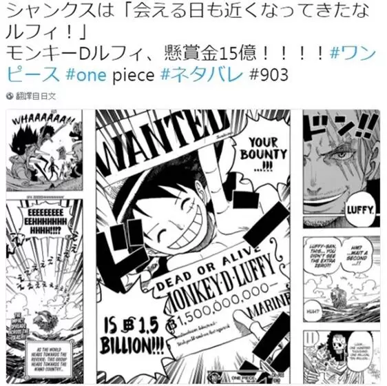 数日前,海外社交媒体传出消息,超人气动漫《航海王》(ONE PIECE)剧情有了重大进展。在最新的第903话连载中,主角"路飞"悬赏金飙升至15亿贝里,在全新剧情中,已被人视为新世界的"第五位皇帝"。