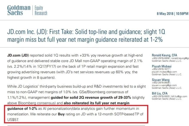“虽然京东在研发上的大量投资,导致了Non-GAAP下的净利润略微有所下降,但是基于自营业务利润率的增长以及广告收入的快速增长,价值京东物流开放给第三方,将如管理层所说的那样,在今年二季度收入将会稳健增长。”高盛分析师在其报告当中表示:“我们重申买入评级,目标价为57美元。”