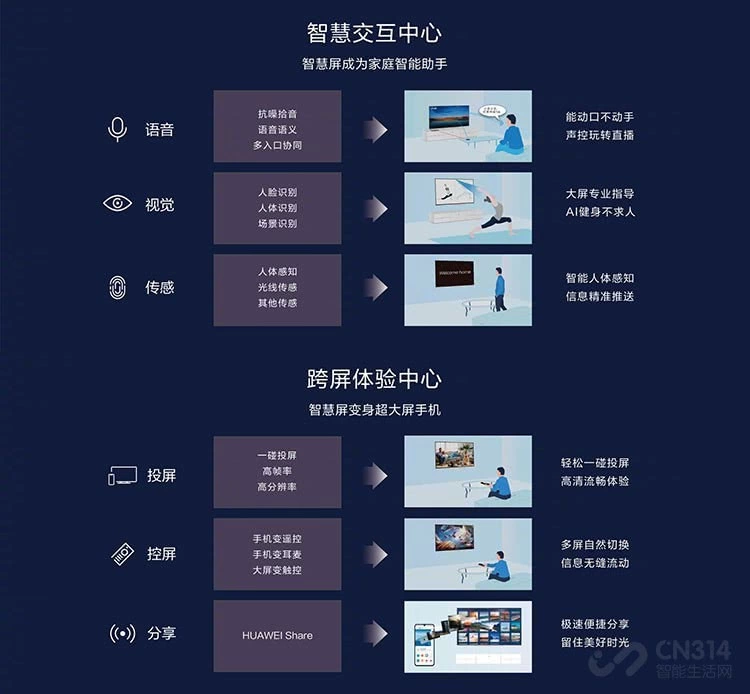 在华为的设想中,智慧屏将成为家庭智能助手,这是因为其语音交互(包括抗噪拾音、语音语义和多入口协同)让用户“能动口不动手,声控玩转直播”,视觉交互(人脸识别、人体识别和场景识别)提供“大屏专业指导、AI健身不求人”体验,再加上传感(人体感知、光线传感和其他传感)带来的“智能人体感知,信息精准推送”,充分利用AI技术提升了用户体验。不只如此,智慧屏所提供的投屏、控屏和分享功能,还可将其变身超大屏手机,跨屏体验更轻松便捷,配合强大IoT控制让智慧屏轻松控制家中各类智能家电,从而成为用户最佳HiLink生态管家,日常家庭场景充分感受“大智慧”。