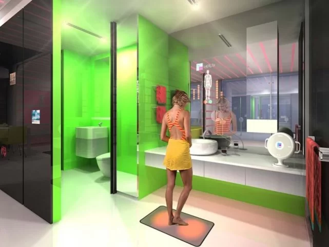 在浴室中也有很多智能的地方,可以自动监测居民的体重、血压、体温和其它指标,并且将总体的健康数据呈现在浴室镜上。