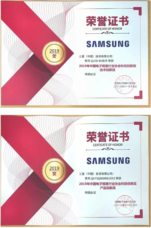 会上,三星斩获两项大奖。其中,QLED 8K技术获得2019中国电子视像行业协会科技创新奖-技术创新奖。QA75Q900RBJXXZ荣获2019中国电子视像行业协会科技创新奖-产品创新奖。