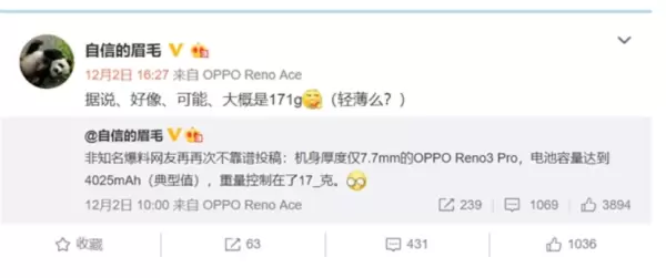 在此前举办的ColorOS 7发布会上,OPPO发布了一个令人惊喜的“彩蛋”——搭载5G双模的Reno3系列将在12月发布上市,引发网友的热议。针对网友的热烈讨论,闲不住的“爆料达人”OPPO副总裁沈义人再次爆料:OPPO Reno3 Pro厚度仅为7.7mm,电池容量达到了4025mAh,且重量仅为171g,可能是同期价位最轻薄的双模5G手机了。