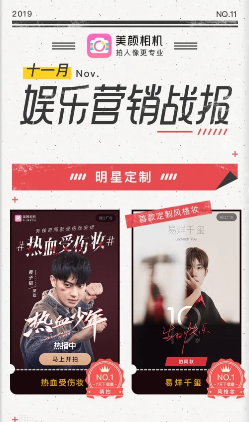 正是基于庞大的年轻用户,美颜相机一直都是各大明星首选的合作app。在刚刚过去的11月,美颜相机就先后与黄子韬、易烊千玺推出了明星定制妆。黄子韬与美颜相机联合推出了热播剧《热血少年》吴乾同款#热血受伤妆#,助推《热血少年》的收视率。易烊千玺官方联合美颜相机推出了易烊千玺定制专属生日祝福效果,这也是美颜相机第一款明星定制风格妆。