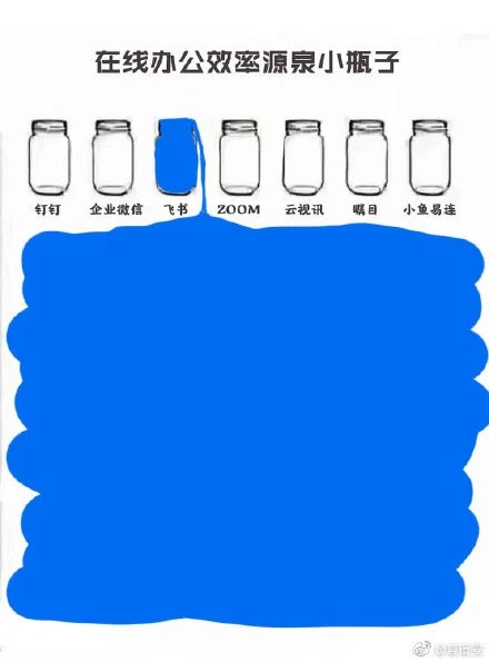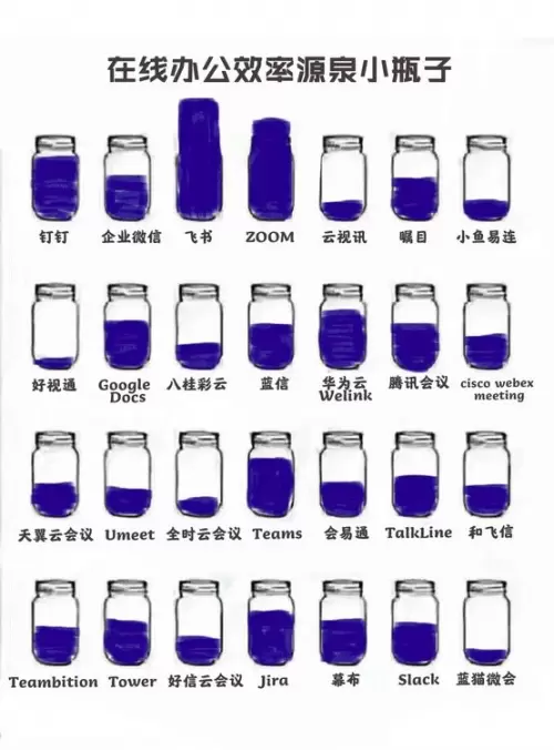 在这张在线办公效率源泉小瓶子图中,堆满了7*4=28个小瓶子,分别对应钉钉、企业微信、飞书、ZOOM等在线办公应用,其中飞书被涂的最满,溢出杯口“直通云霄”,其次是ZOOM、钉钉,随后华为云、Teams、Jira等位列第三梯队,还有一些不常用的在线办公应用只涂了一个瓶底。