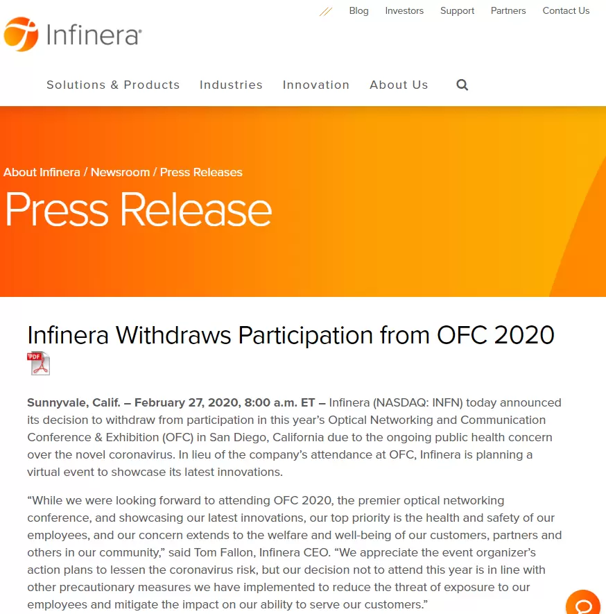 优先考虑员工的健康和安全,Infinera宣布退出OFC 2020