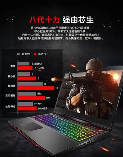 搭载英特尔八代酷睿i7-8750H处理器,六核十二线程性能提升明显,满足大型游戏高配要求;配合超大显存GTX1060 6G显卡,无论是多开小游戏还是高特效3A大作,都可从容应对;8G高频率内存加持,“加速”体验更佳,128G固态硬盘+1T机械硬盘存储组合给予你更多速度和容量上的“发挥空间”。