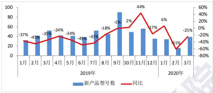 在上市新机型方面,2020年3月,上市新机型39款,同比下降25.0%,其中2G手机4款、4G手机11款、5G手机24款。2020年1-3月,上市新机型89款,同比下降28.8%,其中2G手机13款、4G手机22款、5G手机43款。