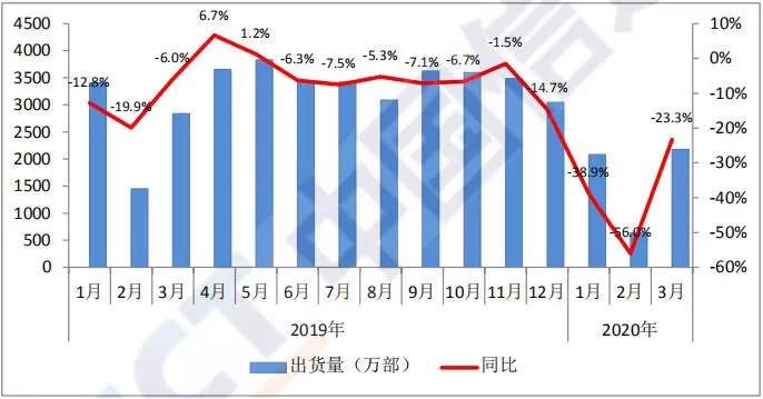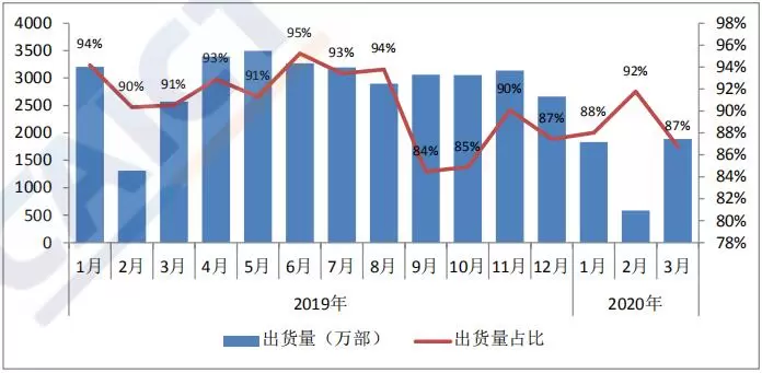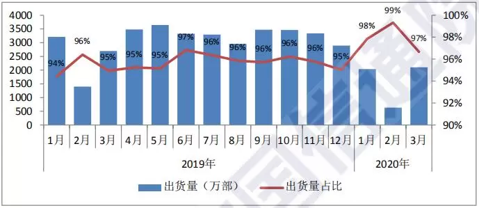另外,2020年1-3月,国内手机市场总体出货量4895.3万部,同比下降36.4%,其中2G手机108.6万部、4G手机3380.7万部,5G手机1406.0万部。