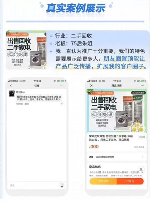 不少商家都对“朋友圈置顶”服务赞赏有加,从事二手回收行业的嘉宜美家修老板表示,使用了“朋友圈置顶”服务后,不仅能让服务与产品得到广泛传播,也把信息展现给了更多人,进一步拓展了自己客户圈。更有数据显示,商家线上推广的效果明显,小步在家早教、中国商旅、淄博小绿腰萝卜等商家,在使用过“朋友圈置顶”服务后,微信入群、电话联系、转化成单都在稳步提升。