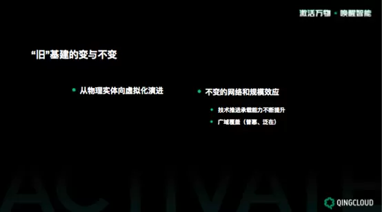 在青云QingCloud产品市场总监陈烈看来,“新基建”之于“旧基建”,变的是从物理向虚拟不断演进,我们需要在虚拟化世界里建设新的基础设施;不变的是基础设施对网络和规模的覆盖能力及承载能力。