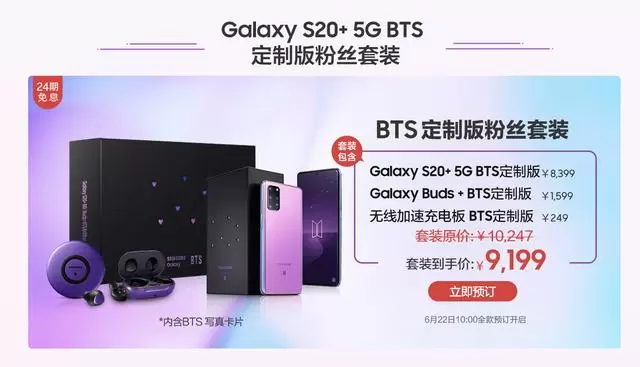 6月22日,备受粉丝们期待的三星Galaxy S20+ 5G、Galaxy Buds+ BTS定制版正式开启预售。作为与超高人气组合防弹少年团(BTS)共同推出的定制版本,三星Galaxy S20+ 5G|Buds+ BTS定制版不仅诠释了偶像魅力与前沿科技的完美融合,更为全球的BTS粉丝送上了一份特别惊喜。现在,喜爱三星与BTS的星粉和BTS粉丝们都可以登陆三星网上商城,京东、天猫、苏宁三星手机官方旗舰店,或全国线下门店参与预约。凡预订BTS定制版粉丝套装的消费者可享到手价9199元的惊喜优惠,包含Galaxy S20+ 5G BTS定制版(建议零售价8399元)、Galaxy Buds+ BTS定制版(建议零售价1599元),以及无线加速充电板BTS定制版(建议零售价249元),同时还可享至高24期免息分期,即刻下单即刻预订来自Idol的专属福利。