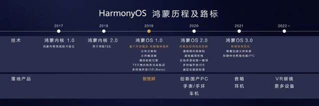 2019年8月,在2019华为开发者大会上,华为消费者业务CEO余承东正式发布了自有操作系统鸿蒙,并公布了发展规划。华为计划在2020年推出鸿蒙OS 2.0,并应用在创新国产PC、手表/手环、车机上;2021年将推出鸿蒙OS 3.0,应用在音箱、耳机上;2022年之后,将应用在VR眼镜等更多设备之上。