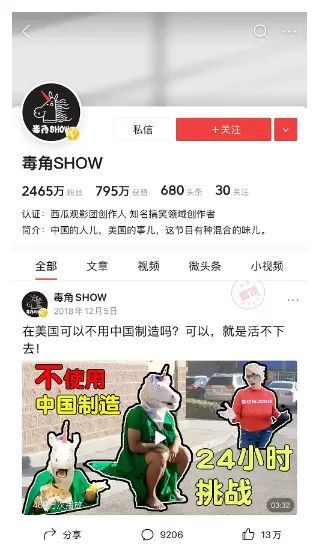 名为毒角SHOW,IP标志也是一只独角兽的头套,于是他称自己为角角。但其实在这个萌萌哒名字和形象之下,活着一个货真价实的东北大汉。