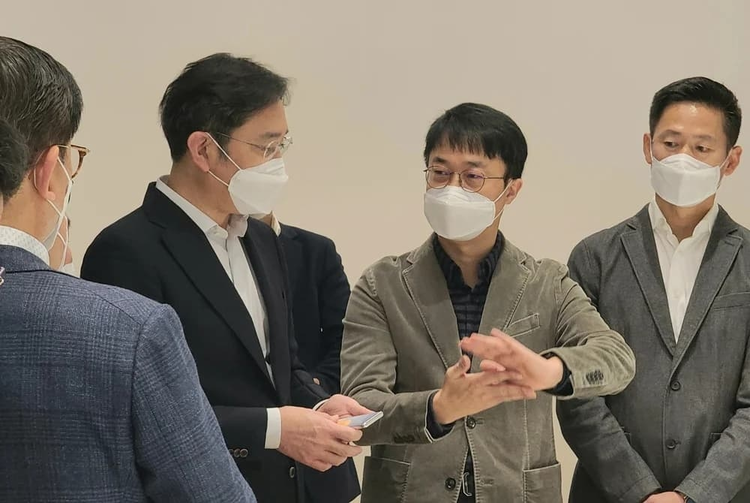 三星官方发布的其中一张照片显示,李在镕手持一部以前从未公开过的新智能手机,这也引起了人们对这次会议的关注。在与三星研发中心的研究人员交谈时,李在镕手持银色智能手机。