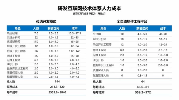 基于上述配置要求,“传统开发模式”和“飞算全自动软件工程平台”两者人力成本的相关费用对比如下所示: