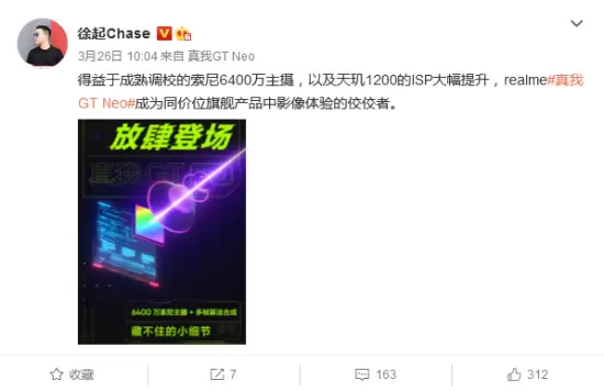 而在影像方面,目前已经确定真我GT Neo将搭载索尼的IMX682主摄,像素为6400万,拥有1/1.7英寸大底,能硬件直出6400万超高清照片。realme副总裁、全球营销总裁徐起发文称,“得益于成熟调校的索尼6400万主摄,以及天玑1200的ISP大幅提升,真我GT Neo将成为同价位旗舰产品中影像体验的佼佼者。”