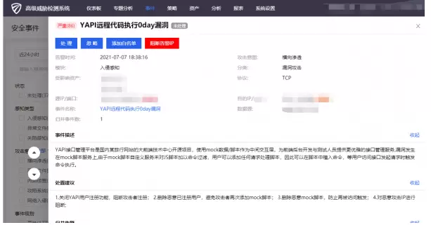 私有云客户可通过旁路部署腾讯高级威胁检测系统(NTA、御界)进行流量检测分析,及时发现黑客团伙利用漏洞对企业私有云的攻击活动。腾讯高级威胁检测系统(NTA、御界)可检测到利用YAPI接口管理平台远程代码执行漏洞发起的恶意攻击活动。