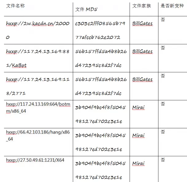BillGates僵尸网络木马及Mirai僵尸网络木马和以往的版本并无差异,这里不再赘述。
