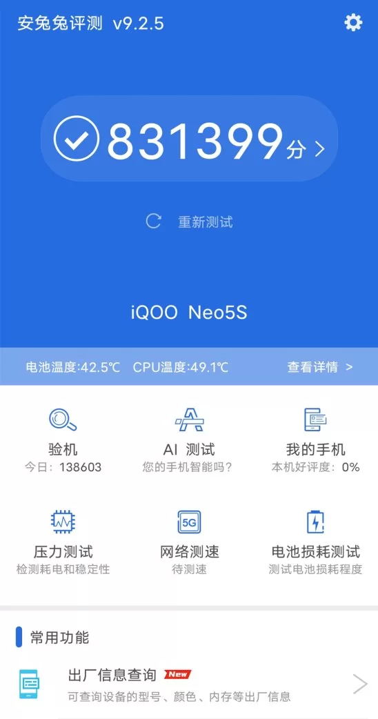 作为2.5k价位段少有的“双芯”旗舰级机型,iQOO Neo5S在提供强悍性能的同时,还能针对游戏场景进行优化。首先,它搭载了高通旗舰芯片骁龙888,该芯片的性能达到了目前安卓阵营的第一梯队水准,无论是日常使用还是游戏场景,都能带来流畅丝滑的运行表现。同时,iQOO Neo5S还配备了增强版UFS 3.1和增强版LPDDR5,能提供更快的数据读写速度、应用调取和缓存速度。从实测跑分来看,iQOO Neo5S的跑分成绩超83万,可见其性能之强悍。