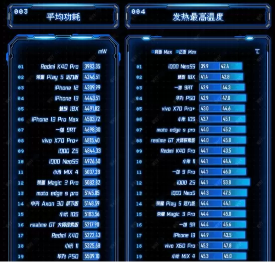 根据第三方评测媒体@WHYLAB 的实测结果,在运行15分钟《原神》的情况下,iQOO Neo5S的机身背面最高温度为39.9℃,正面最高温度为42.4℃,在《原神》游戏性能排行榜的散热项目中排名第一,可见iQOO Neo5S的散热性能确实十分出众。