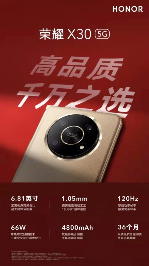 作为八年诚意之作,荣耀X30手机配备66W超级快充、4800mAh长续航大电池组合,很多消费者给与电量大续航久,告别电量焦虑的点评。6.81英寸窄边全视屏,画面流畅屏占比高,看电影、玩游戏效果出色,搭配软硬结合底层调优,整体表现达到了同档位标杆水平,同时可以给用户带来全方位高品质体验,获得用户的一致认可是情理之中。