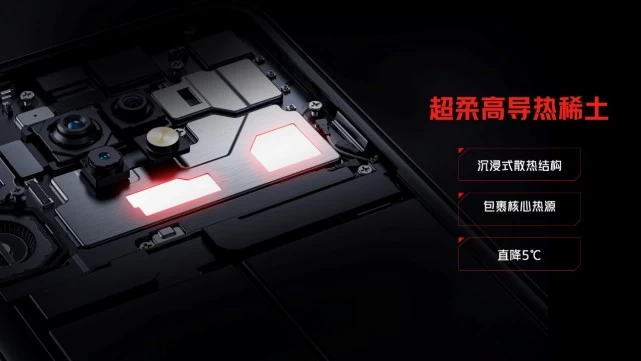 为了更好发挥出全新一代骁龙8移动平台的极限性能优势,红魔7系列在散热方案上也做到了极致。全新升级的ICE魔冷散热系统,由高速离心风扇、4124mm²超大VC散热板、航天级散热材料、超柔高导热稀土等组成9层散热结构,打造全行业首款散热材料面积高达41279mm²的游戏手机。其中,超柔高导热稀土配合转速高达20000转/每分钟的主动散热风扇将热量带走,核心热源温度同比上一代,直降3℃!航天级相变材料石墨烯+正二十一烷更是将导热系数提升400倍,配合金属材质的峡谷风道及新增背部45°角开孔形成双进风口,换气效率大幅提升,最高温度下降2.4℃!成就了目前业界最精密、最强大散热方案。