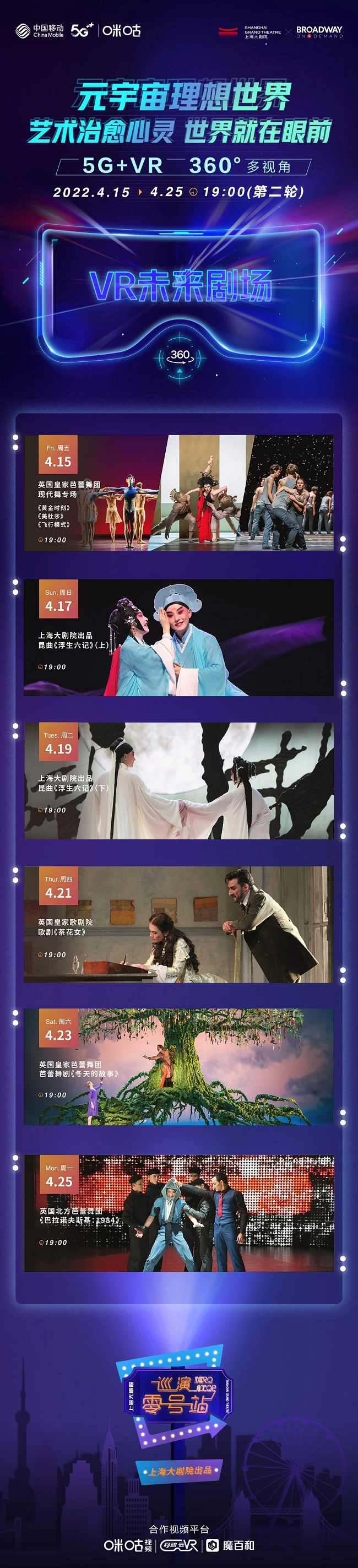3月30日以来,咪咕携手上海大剧院联合打造的“巡演零号站•VR未来剧场”将多部海内外优质艺术作品引入线上银幕,获得了良好的全网传播效果。为了响应观众对高品质演艺内容的热切需求,《巡演零号站》精选内容限时返场(二轮)于4月15日再度起航,呈现更多来自世界各地的优质舞台作品,用科技帮助宅家抗疫的人们缩短与世界的距离,开启元宇宙云端演艺时代。新一轮演播为观众免费播映六期精选节目,集结了芭蕾舞剧《冬天的故事》、《巴拉诺夫斯基:1984》,现代舞《黄金时刻》、《美杜莎》、《飞行模式》,歌剧《茶花女》,昆曲《浮生六记》等来自海内外顶尖艺术团的经典作品。作为本次返场的合作视频平台,移动云VR延续“天空盒”技术,打造赛博朋克未来剧场观影模式及XR效果未来剧场,以前卫科技碰撞经典戏剧,带来超强反差创新观演体验。