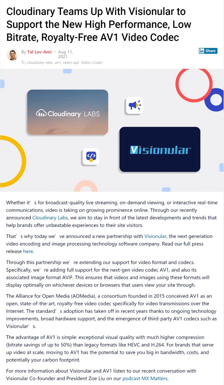 8月11日,Cloudinary在其官网正式宣布了与Visionular微帧合作的好消息,旨在进一步扩大Cloudinary对媒体格式和编解码的广泛支持,通过采用微帧提供的Aurora-AV1编码解决方案,为用户提供最佳的视频、图像观看体验。