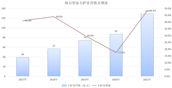 而海尔智家早在很多年前布局的卡萨帝,收入增长越来越快,2021年同比增长48.3%至129亿元,成为高端市场的绝对引领者。