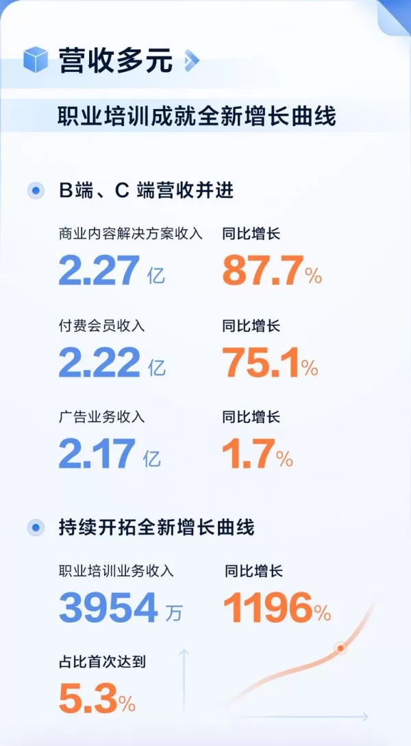值得注意的是,职业教育业务异军突起,收入占比达到5.3%,同比增长达到了惊人的1196%。这表明知乎整体收入规模增长的同时,全新增长曲线已经形成,并且保有快速增长的势头。