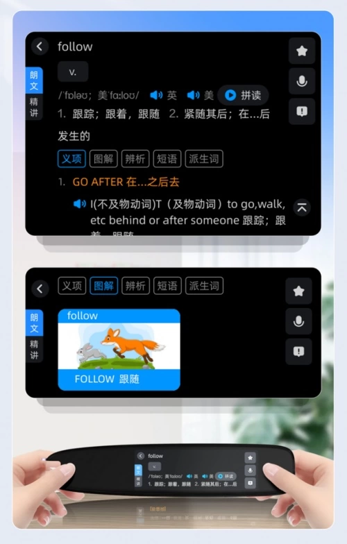 查词功能方面,新增了朗文词典第六版和海词,词汇数量高达1200万,足够支撑全学段的英语查询和翻译。相较于如布AI词典笔标准版,V10新增了“点查”功能,用词典笔轻“点”一下单词,就能精准查到单词释义。