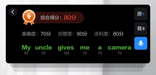 长句发音测评细化至单词,每个单词都有评分,孩子能清楚知道到底是哪个单词发音不标准,需要提升。
