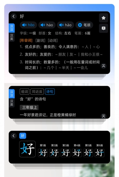 如布AI词典笔V10不仅在英语学习方面表现优秀,在汉语学习方面的表现也可圈可点。动态笔顺描红以及标准的汉语发音,这对于正在学汉字的孩子来说非常重要。值得一提的是,如布AI词典笔V10在知识点拓展方面做到了极致,汉字不仅有释义、结构、部首、组词等基本信息。还包含汉字的古诗词按学段做了等级划分,学习更有针对性。