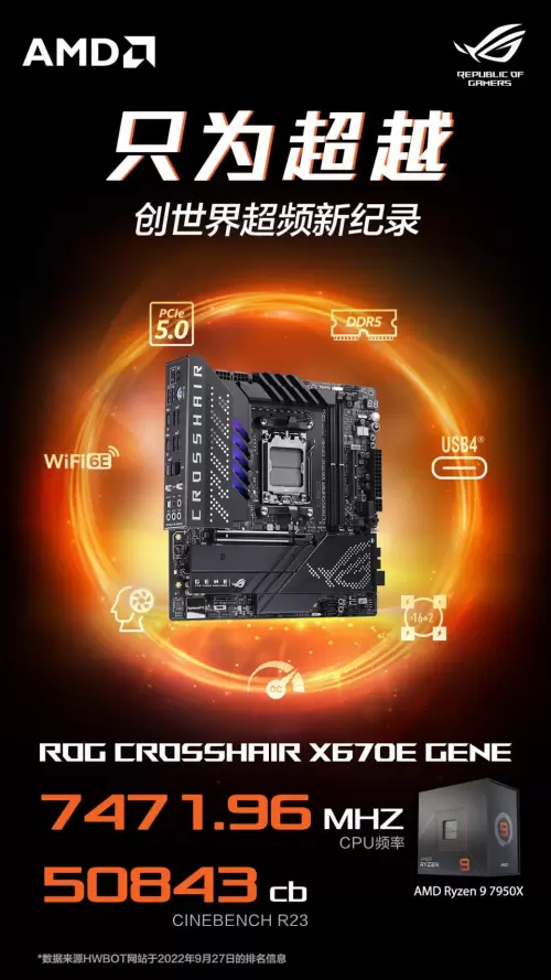 随着AMD锐龙7000系处理器正式解禁,华硕ROG CROSSHAIR X670E GENE主板也创下新纪录。不仅一举将AMD锐龙9 7950X处理器超频至7471.96MHZ,并在Cinebench R23测试中获得50843分,可谓实力过人。华硕ROG玩家国度系列主板以其创新的设计、强劲的性能、出众的颜值,历来受到硬核发烧友和骨灰级玩家的喜爱。