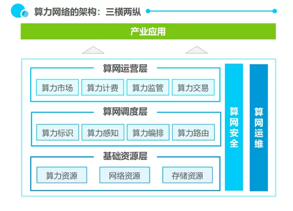 《白皮书》将当前算力网络建设全景分为基础资源层、算网调度层、算网运营层、算网安全层、算网运维层、产业应用层六大层。其中,算网运维和算网安全贯穿全程, 形成“三横两纵”的支撑形态。