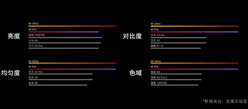 除了以上这些显性参数外,坚果N1 Pro和N1 Ultra在不易被感知的参数上同样下了功夫,例如色准、亮度均匀性、色深等。