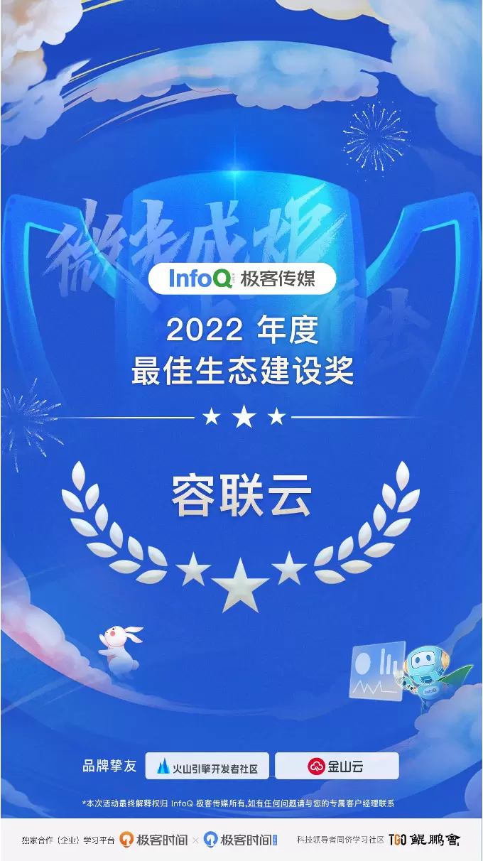 近日,InfoQ发布2022年度最佳生态建设奖,容联云凭借在业务生态合作领域的多重举措,和行业优势及生态服务能力荣获此项殊荣。