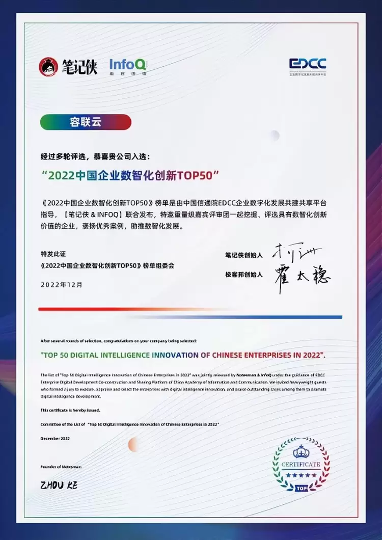 同时,InfoQ联合笔记侠,在中国信通院 EDCC 企业数字化发展共建共享平台的指导下,发布了“2022 中国企业数智化创新 TOP 50”榜单,容联云荣获“数智化企业服务创新 TOP15”。