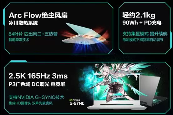内置的冰川散热架构,由双84叶片Arc Flow绝尘风扇+四出风口+五热管组成,支持智能降噪技术。采用15.6英寸2.5K 165Hz电竞屏,拥有3ms疾速响应、G-SYNC防撕裂技术、100% DCI-P3色域覆盖等特性,可助玩家把控战场中的每一丝细节。