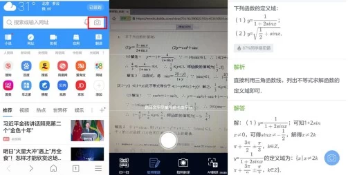 去相关的社区或社交网站上发布“求助贴”?似乎有点“远水接不了近渴”;给老师打电话求助?也不太现实。搜狗手机浏览器Android 5.15.10上线后,用户只要点击首页搜索框上的相机按钮,选择拍照搜题,对着不会的题目轻轻一扫,就可秒出解题方式。