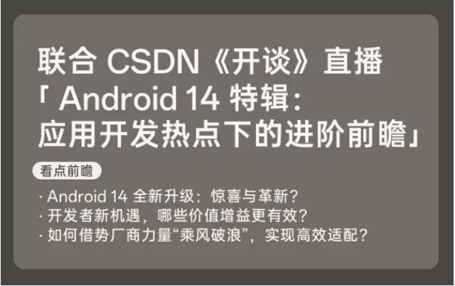 值得关注的是,OPPO 还将联合专业技术社区CSDN,通过举办直播活动——“Android 14 特辑:应用开发热点下的进阶前瞻”,邀请多方行业专家与开发者对话,集中分享适配经验。届时,多领域技术专家将齐聚直播间,共同探讨Android 14 新特性与适配指南。