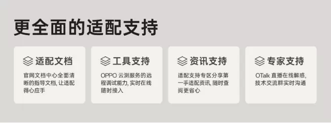 为解决开发者适配工作的难点,OPPO 将提供包括适配文档、适配工具、适配资讯以及专家交流等在内的支持与服务。其中,全面清晰的适配指导文档,能让不同类型App开发者快速找到适配方案;实时在线的云测服务提供远程调试能力,有效模拟真实用户场景,帮助开发者快速验证,在增加效率的同时降低适配成本。